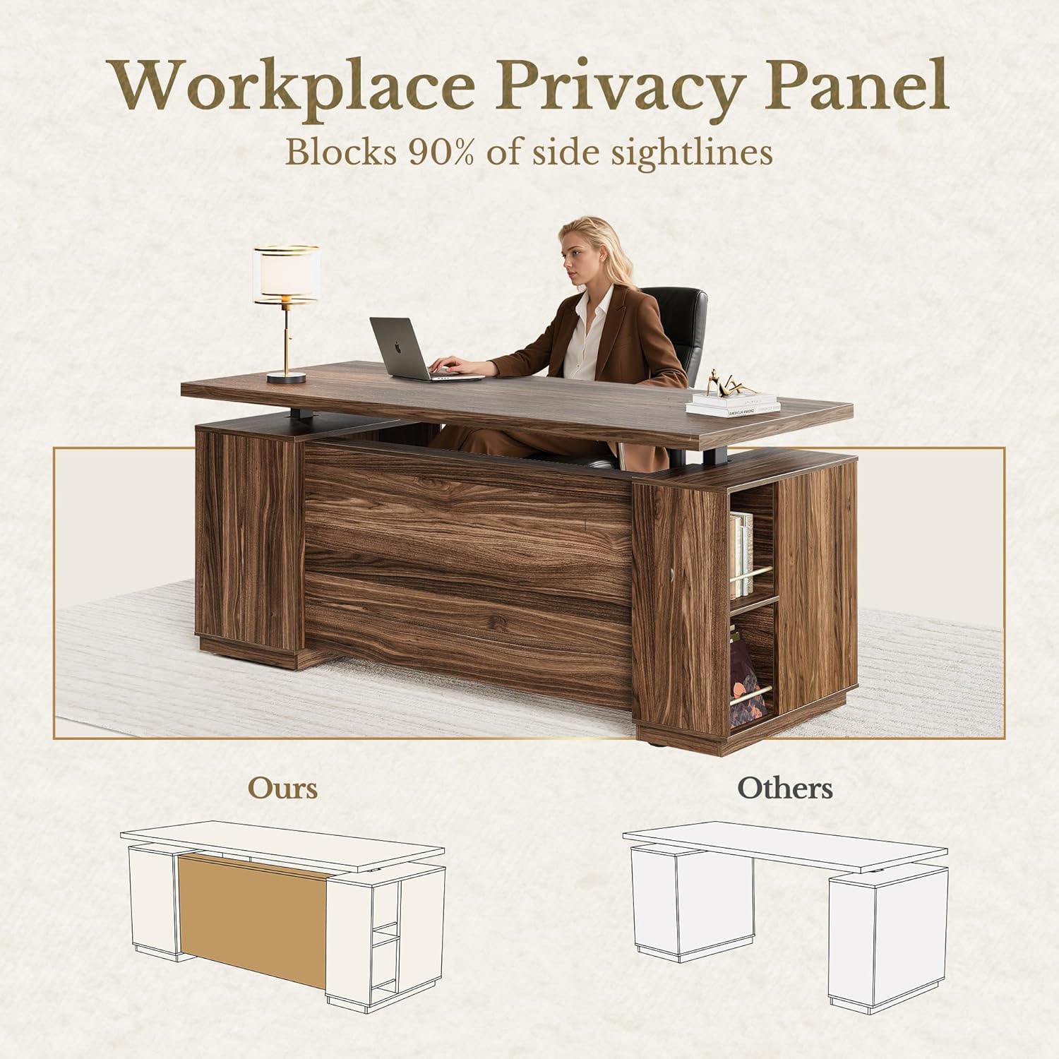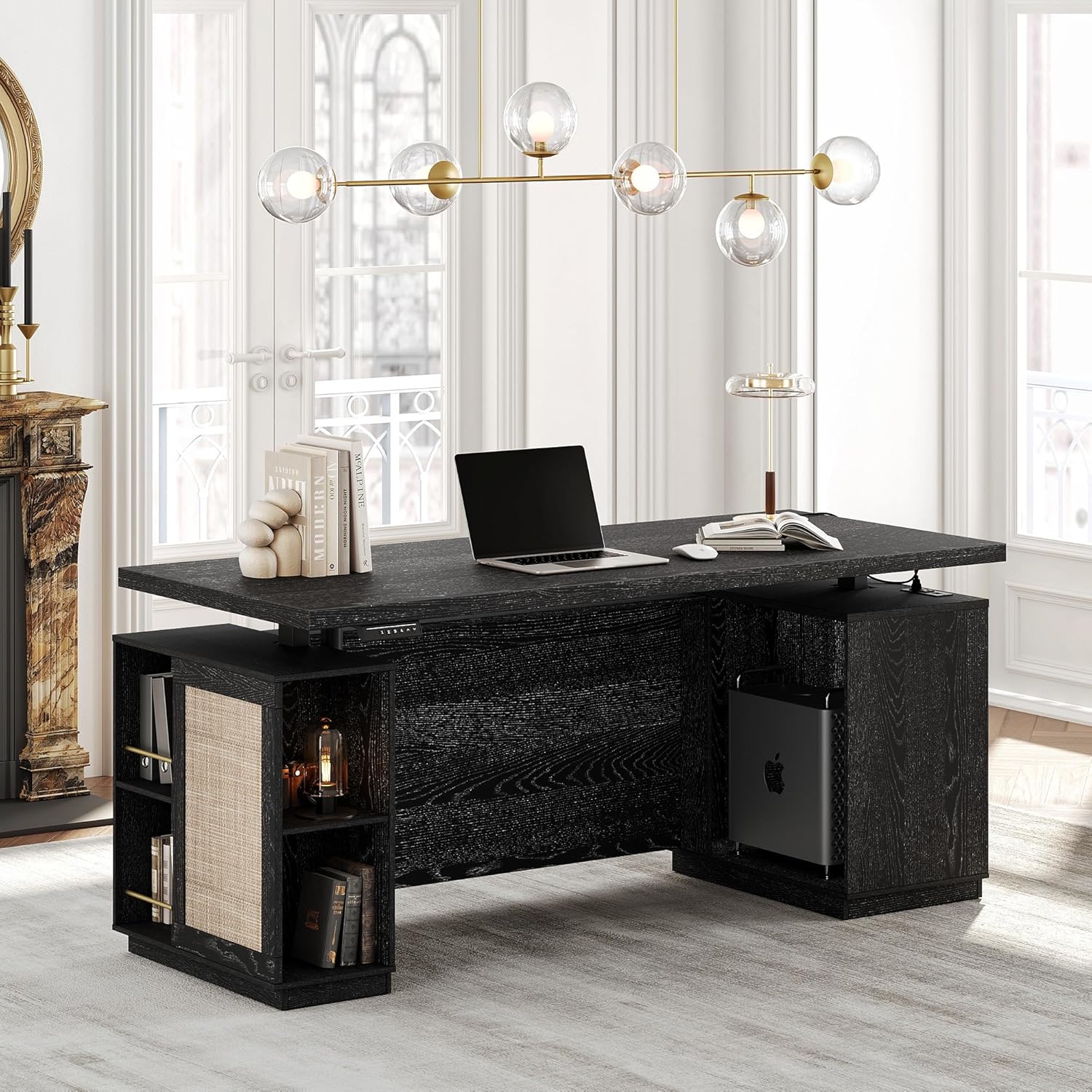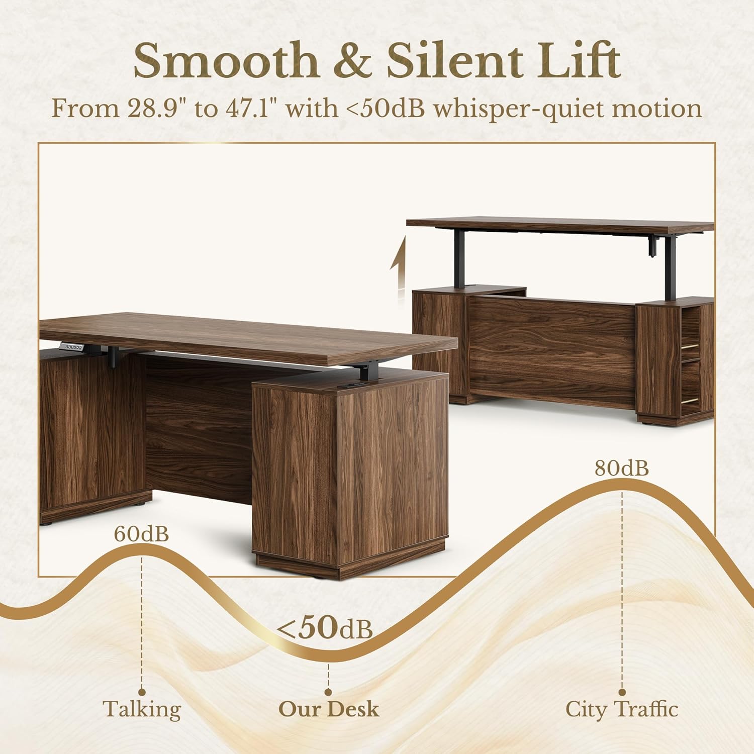 70" Standing Desk with Storage, Executive Electric Height Adjustable Stand Up Desk with AC/USB, Privacy Panel, Large One-Piece Destop, Fluted Computer Desk, Black Walnut