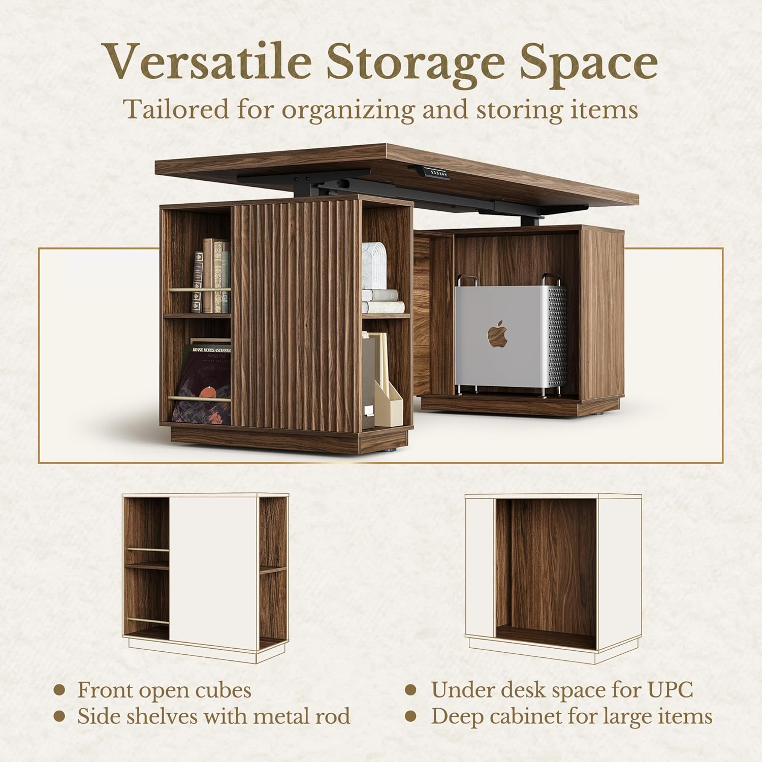 This modern executive standing desk combines a spacious 70"x30" desktop with sturdy steel frame, smart memory controls, and thoughtful storage design—including a dedicated CPU compartment. Perfect for dynamic workspaces that demand comfort, organization, and durability.Finished in black walnut with vertical slat accents, it's a stylish fit for modern and Scandinavian interiors.