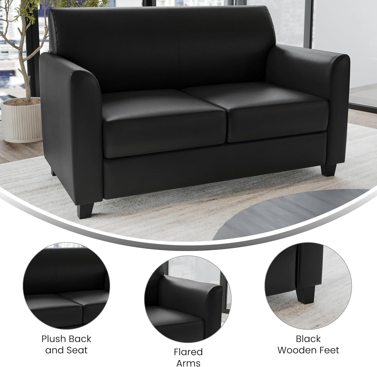 Add convenient, stylish seating just about anywhere with the Flash Furniture Hercules Diplomat Series LeatherSoft Loveseat. This versatile loveseat offers a comfortable and reliable seating solution that creates a welcoming atmosphere in lobbies, offices, training rooms, libraries, business centers, and other residential or commercial spaces. Boasting a soft and durable black LeatherSoft upholstery with a clean line stitching trim design and black wood raised feet, the modern appeal of this LeatherSoft loveseat will make a lasting impression in any office. The seat and back feature foam padded cushions to keep your guests and clients comfortable, and the flared padded arms provide the perfect resting space for your arms. Constructed with a durable hardwood frame, this contemporary reception loveseat withstands years of quality use, and the raised feet make it easier to clean the flooring beneath. The small sofa for waiting rooms measures 52"W x 29"D x 32.25"H with a 42"W x 19.5"D x 17.5"H seat size and 50"W x 16"H back size to provide spacious seating for 2 adults while fitting neatly in any home or lobby.