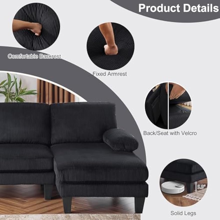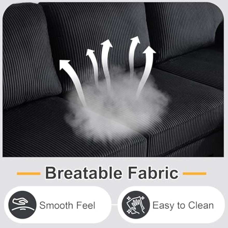 Karl home U-Shape Sectional Sofa Couch 111" Modern 4-Seat Sofa with Chaises Corduroy Fabric Upholstered Covertible Couch with Wood Grain Legs for Living Room, Reception Room, Apartment, Black