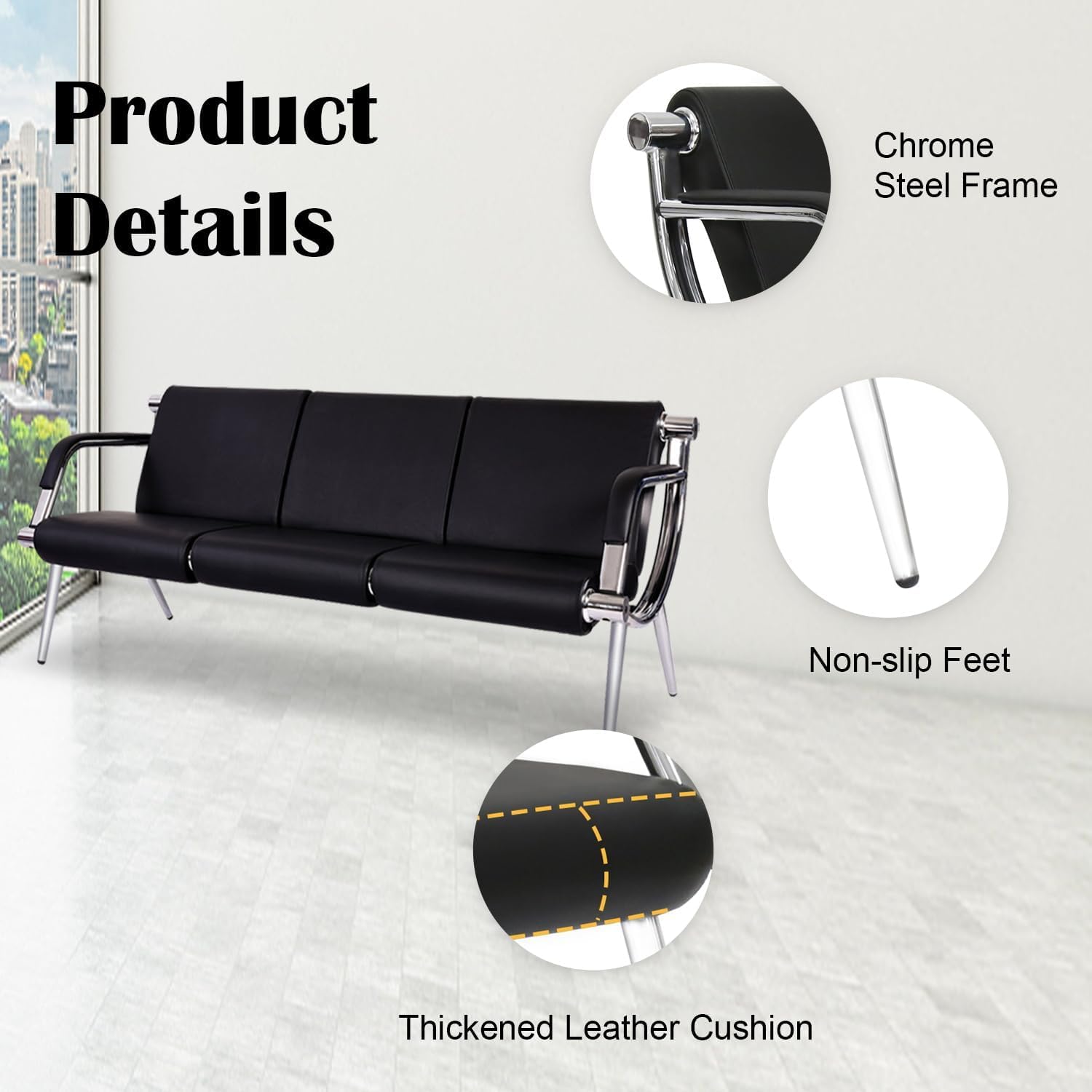 Kinsuite 3-Seat Office Reception Waiting Room Chairs - Guest & Reception Chairs for Salon Barber Bench Airport Bank Hall Visitor Guest Black PU Leather Office Sofa, Black